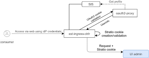 La autenticación de UIs de administración de Stratio KEOS (Stratio GoSec y Stratio Command Center) se apoya en el single sign-on de la plataforma, compuesto por nginx-ingress-controller, oauth2-proxy y Stratio Identity Server (SIS):